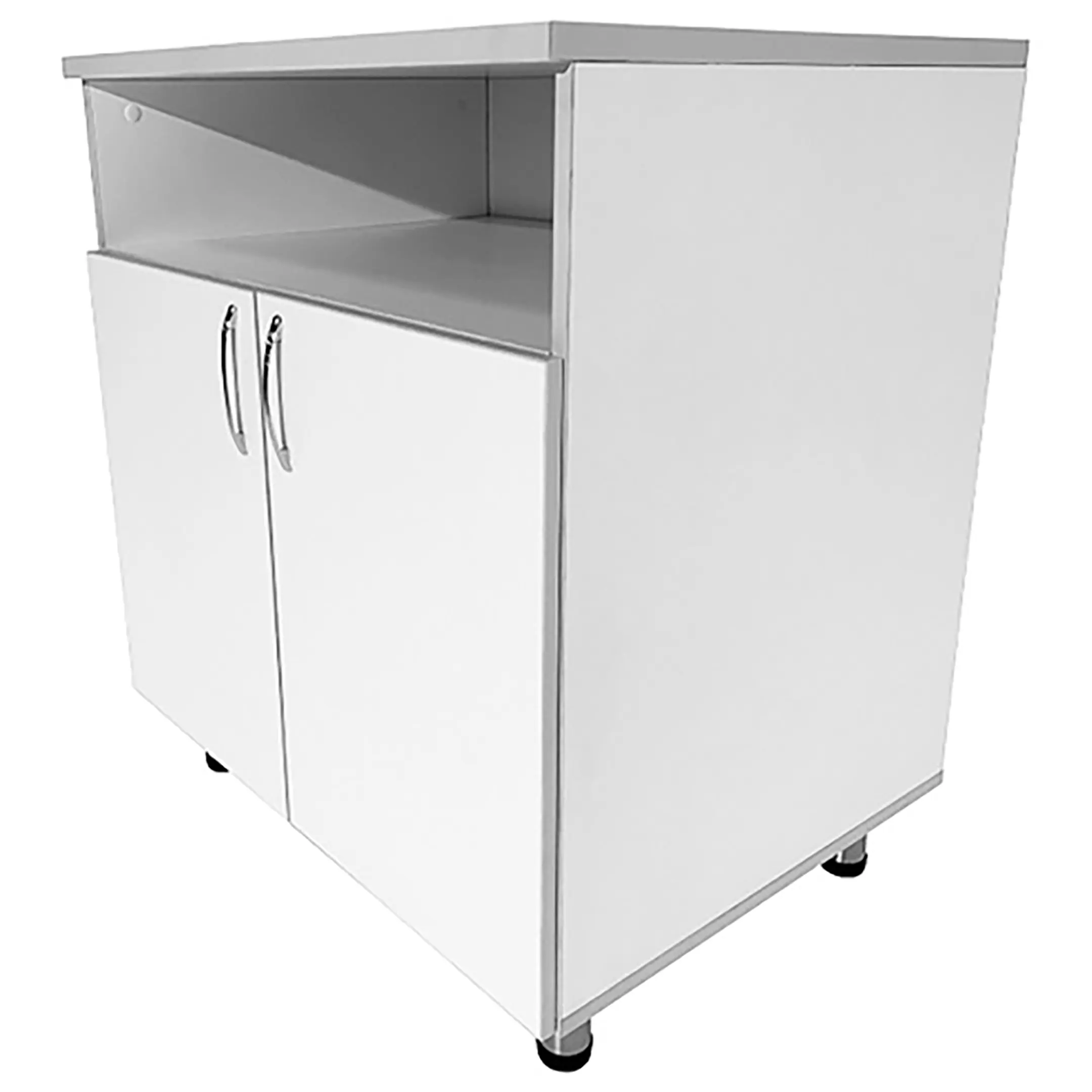 - Многофункциональное пространство для хранения: Под столешницей тумбы расположены большая ниша и вместительное отделение с двумя распашными дверками и полкой внутри. Это позволяет удобно организовать хранение различной медицинской аппаратуры и предметов.