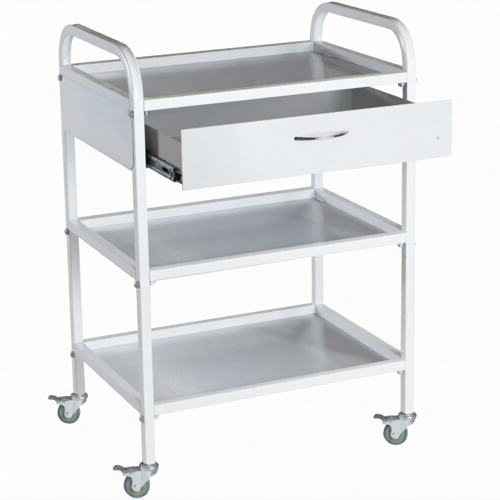 Стол медицинский инструментальный СМИ-03-01 (полки металл, колёса серая резина) предназначен для размещения инструмента, лекарственных препаратов и приборов.
