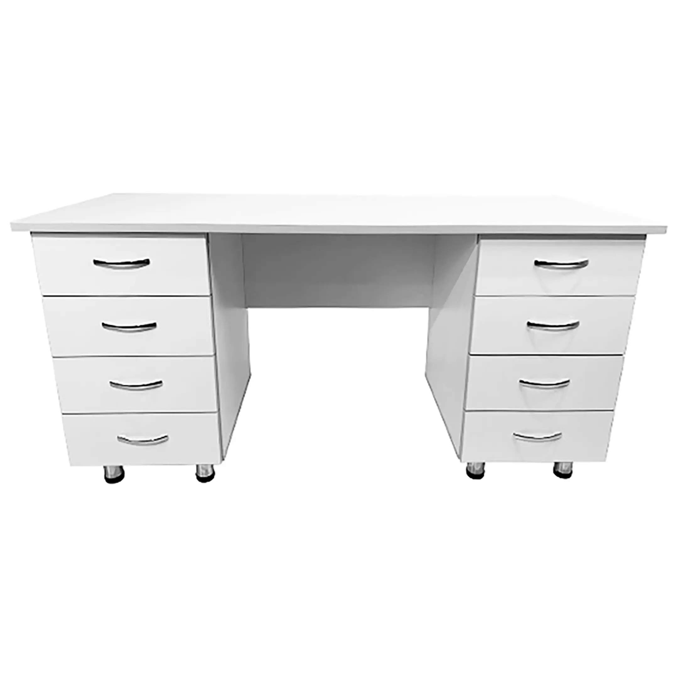 Ключевая особенность данной модели - наличие двух боковых тумб, каждая из которых оснащена четырьмя выдвижными ящиками. Это предоставляет удобное и организованное хранение документов, инструментов и других необходимых материалов. Сочетание белого цвета ЛДСП с светло-серой кромкой создает стильный и современный внешний вид стола.
