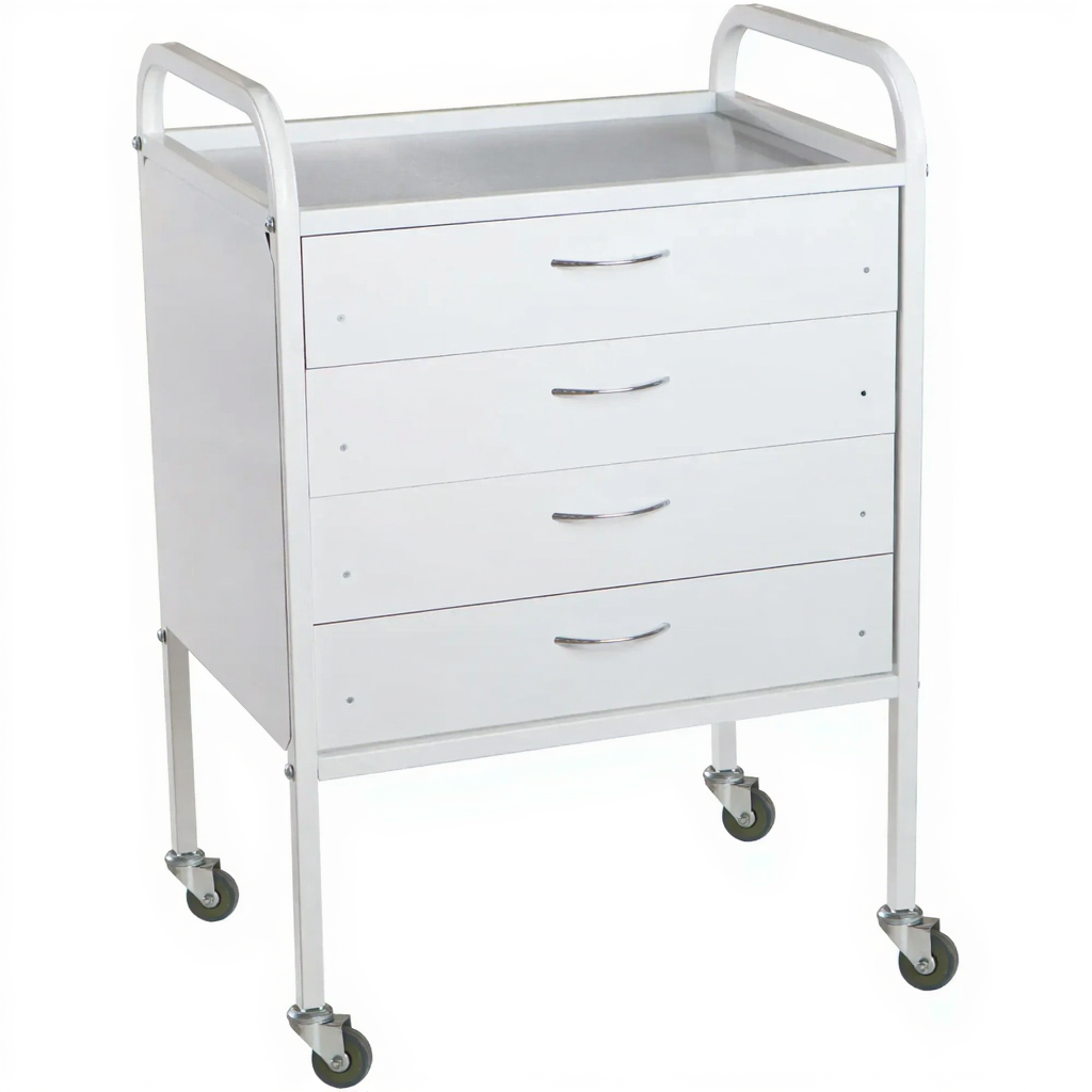 - Верхняя полка из металла — размером 535×375 мм, устойчива к обработке дезинфицирующими средствами, служит для хранения наиболее часто используемых предметов (по заказу доступны полки из нержавеющей стали).