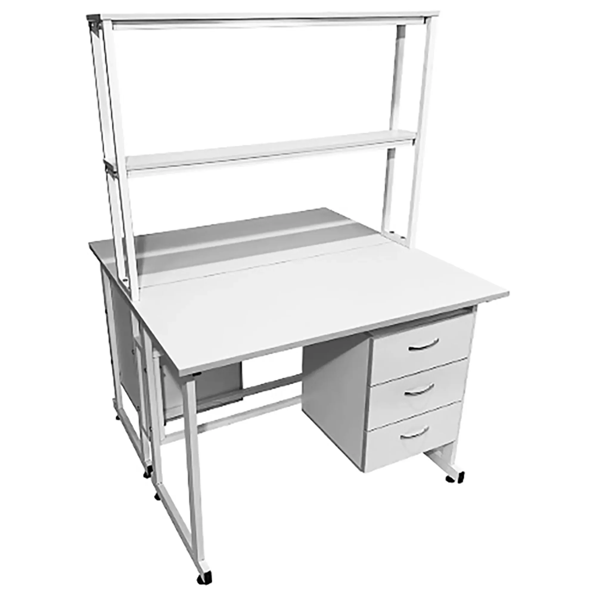 Стол лабораторный островной с надстройкой Сло 22.015 (белый) идеально подходит для создания двух функциональных рабочих мест в лабораториях и медицинских учреждениях. Модель оснащена двумя рабочими местами, каждое с подвесной тумбой с тремя выдвижными ящиками, и центральной надстройкой с двумя полками. Каркас выполнен из стального профиля, столешницы из ЛДСП толщиной 22 мм.