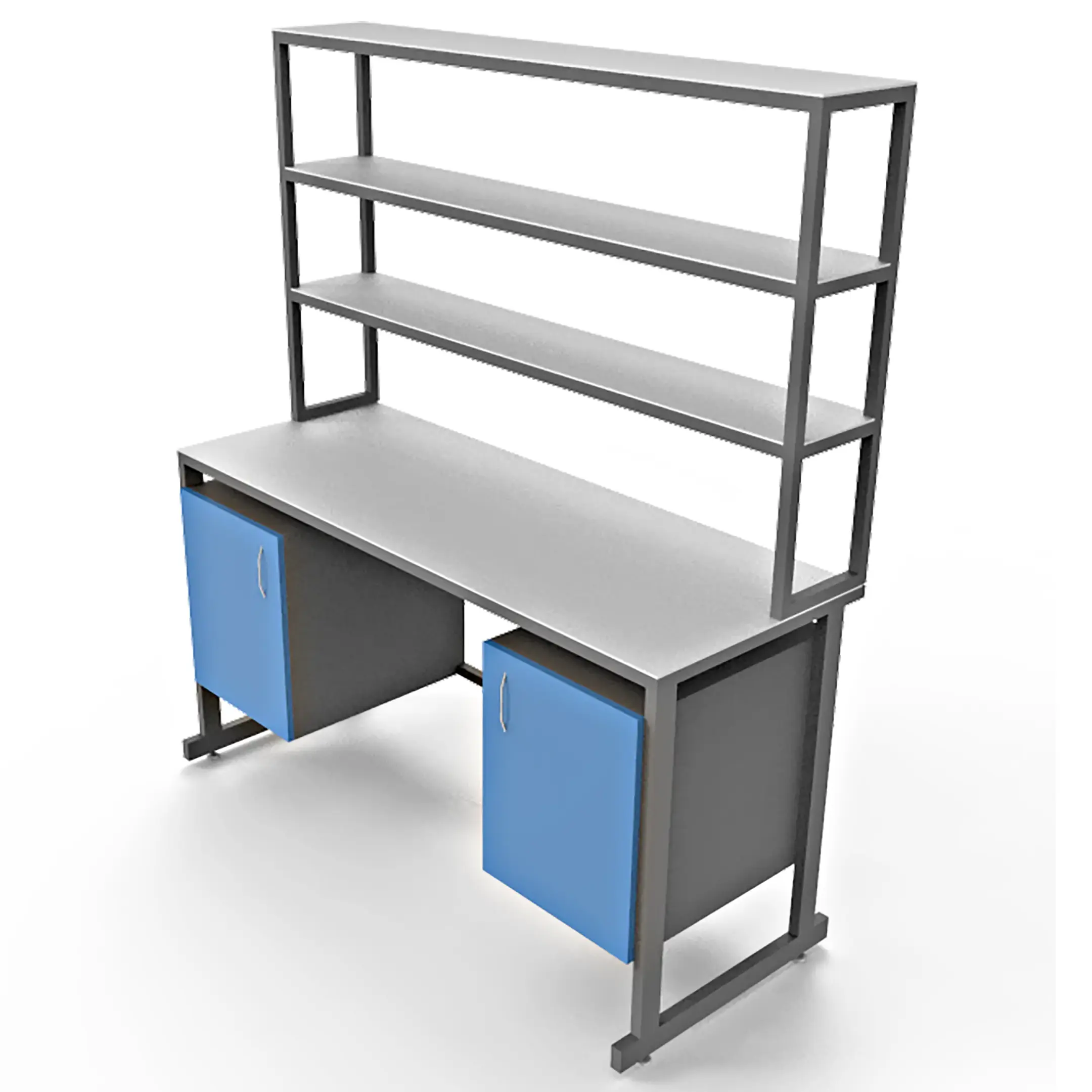 - Вместительная система хранения — надстройка с тремя полками и две тумбы под столешницей с распашными дверцами для хранения оборудования.