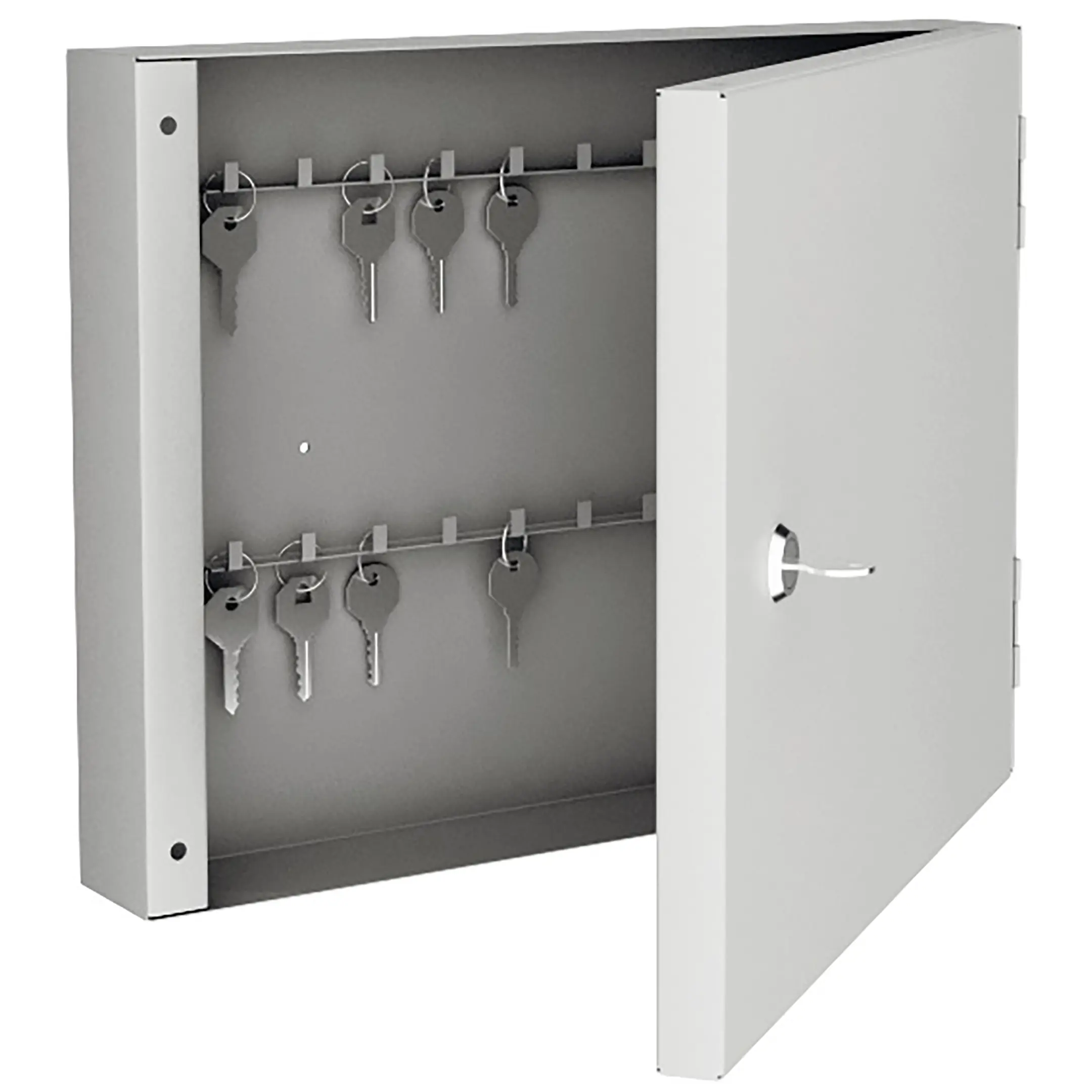 - Компактность и достаточная вместимость для типовых задач — ключница рассчитана на хранение 40 ключей, что является оптимальным решением для объектов с ограниченным количеством помещений, таких как небольшие офисы, студии, салоны, кабинеты или пункты приема клиентов. Ее размеры позволяют легко разместить шкаф на стене в удобном месте, не занимая много пространства.