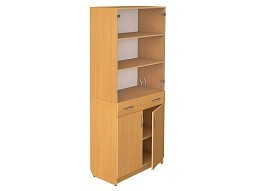 Шкаф со стеклом с ящиком для класса — это функциональное и вместительное решение для хранения учебных пособий, книг, документов и канцелярских принадлежностей в школах и образовательных учреждениях. Модель имеет комбинированную конструкцию: верхняя часть со стеклянными дверцами для демонстрации содержимого и нижняя часть с выдвижным ящиком. Корпус выполнен из ЛДСП 16 мм цвета «Бук Бавария» на регулируемых опорах.