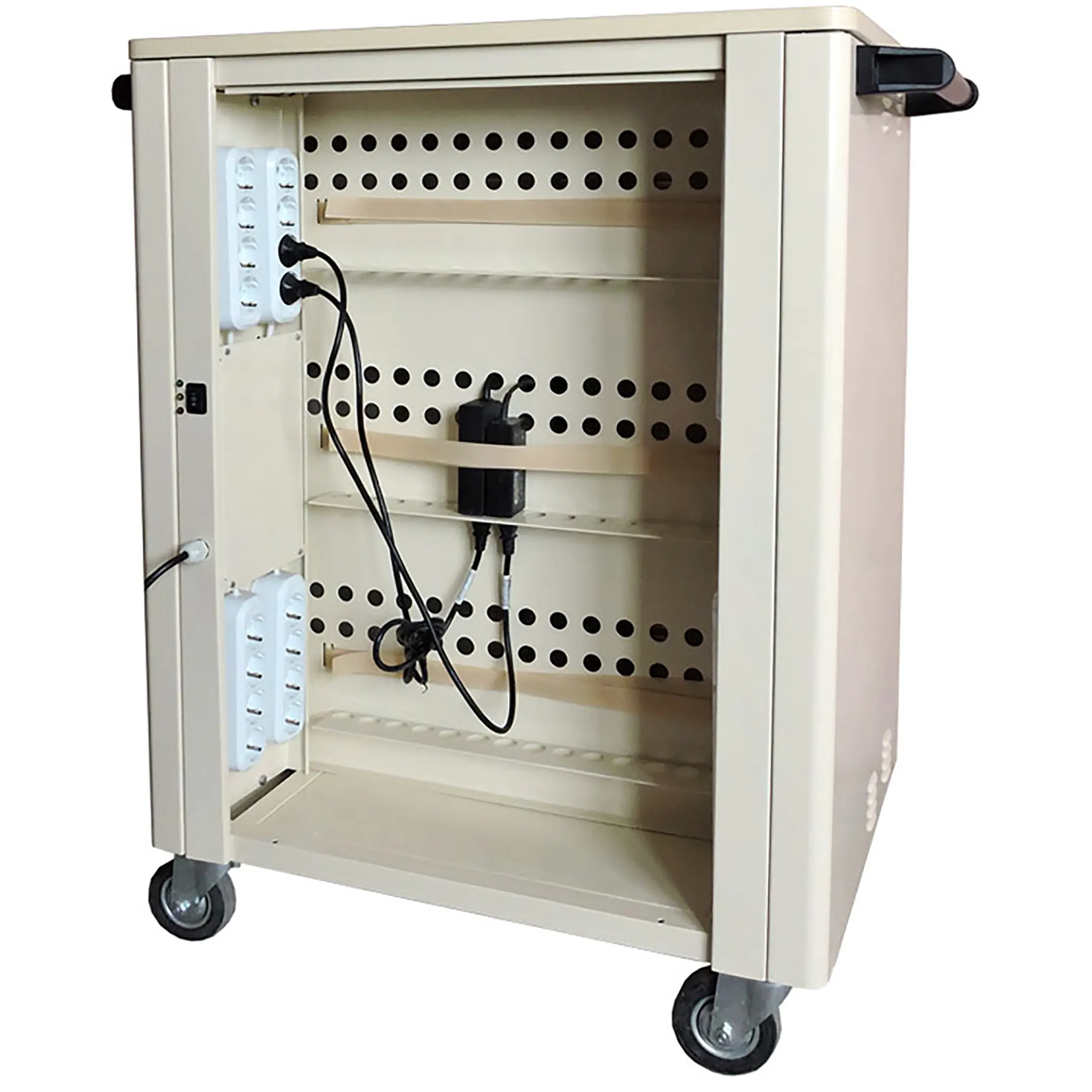 - Централизованная зарядка и хранение — позволяет одновременно заряжать все планшеты (обычно от 10 до 40 устройств) от одной розетки, благодаря интеллектуальной системе распределения питания, и хранить их в защищенных индивидуальных отсеках.