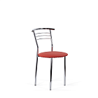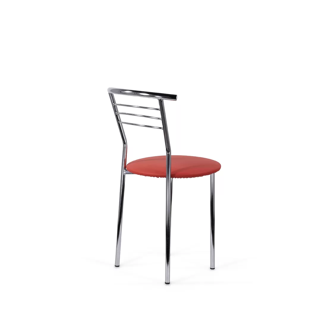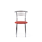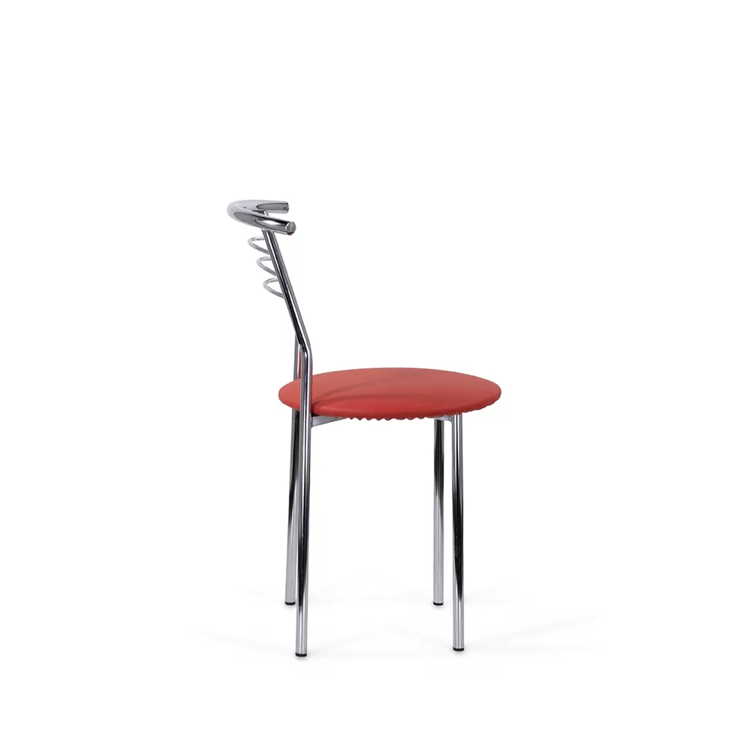 Стул с широким круглым сиденьем и удобной округлой хромированной спинкой. Простые, четкие линии силуэта и компактный размер стула хорошо смотрится на кухне, в столовой, в помещениях кафе.