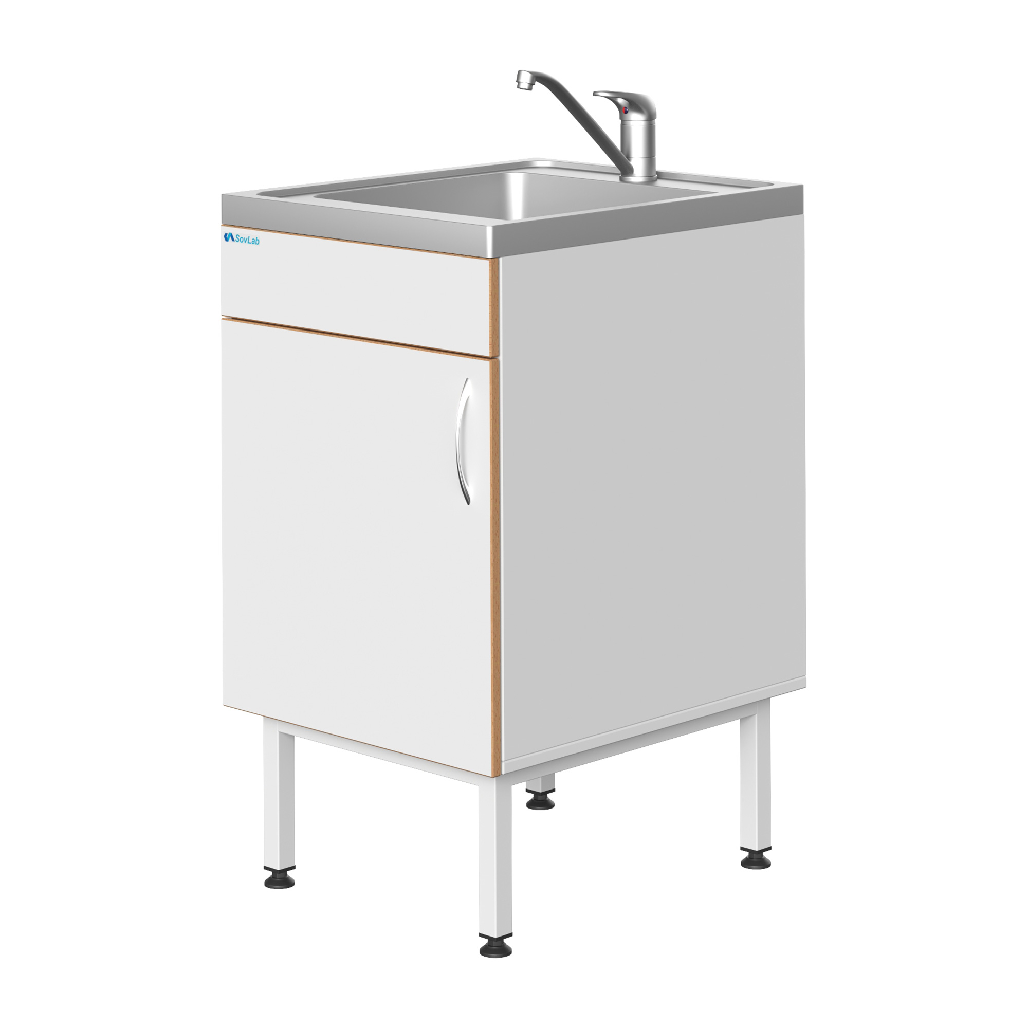 Мойка СОВЛАБ 500 НЖ нерж — это компактное специализированное лабораторное оборудование, предназначенное для качественной и безопасной мойки лабораторной посуды, приборов и инструментов. Модель оснащена одинарной чашей из нержавеющей стали, объединенной в единый блок со столешницей, смесителем и всей необходимой арматурой для подключения к инженерным сетям. Тумба из влагостойкого ДСП установлена на прочный металлический каркас с регулируемыми опорами.