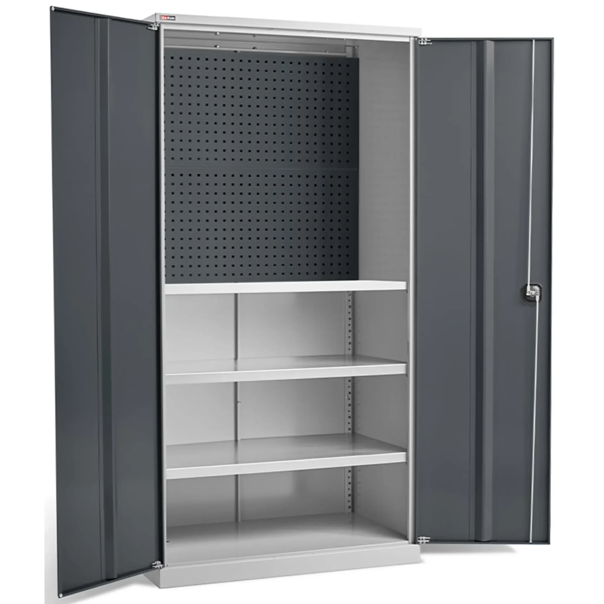 - Наглядная организация и быстрый доступ — шкаф оборудован перфорированными панелями (система «перфо») на внутренних поверхностях, которые позволяют размещать инструмент с помощью крючков и держателей. Это обеспечивает мгновенный визуальный контроль наличия всех предметов, ускоряет процесс работы и помогает поддерживать идеальный порядок.
