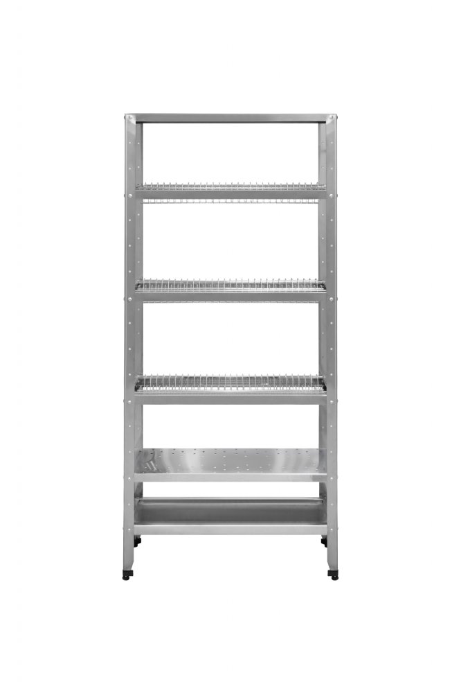 5 полок (сверху-вниз: верхняя сплошная, 3 полки для посуды, перф.полка для сушки стаканов) + поддон-полка с углублением для сбора стекающей воды.