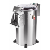 Процесс очистки происходит за счет трения корнеплодов об абразивную поверхность диска и стенок загрузочной камеры совместно с подачей воды. Выгрузка корнеплодов осуществляется за счет центробежной силы. Такой способ очистки корнеплодов позволяет достигать степени очистки до 95%. Следует отметить, что ни одна картофелечистка не очищает корнеплод на 100%, и его необходимо будет дочищать с помощью ножа. После процесса очистки, мезга удаляется через отверстие станины по шлангу напрямую в канализацию или через специальный фильтр (мезгосборник, в комплекте не поставляется).