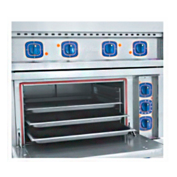В корпус плиты встроен жарочный шкаф для трех противней 530х470 мм. Мощность нижних и верхних блоков ТЭНов шкафа регулируется отдельно. Рабочий диапазон температур составляет от 20 до 270 °C.