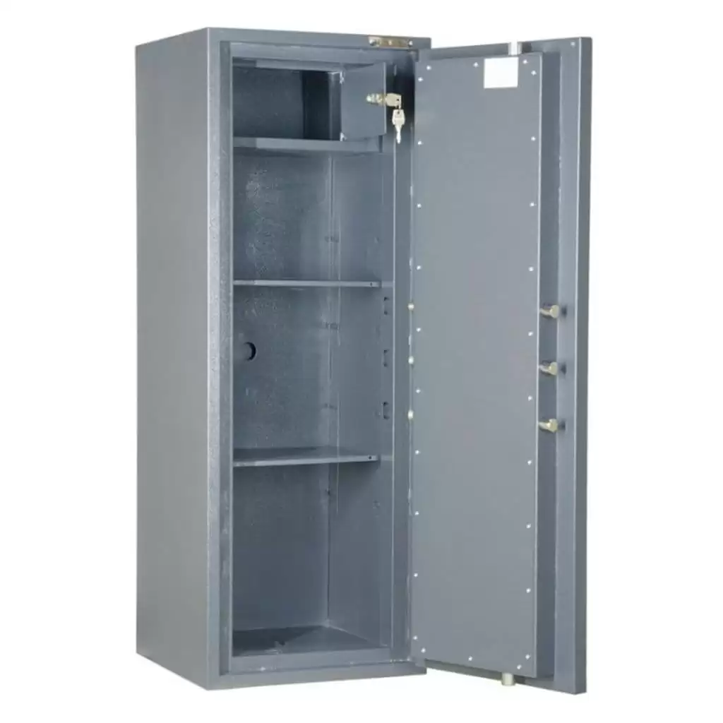 • Сейф односекционный, оснащен двумя съемными полками и Трейзером.