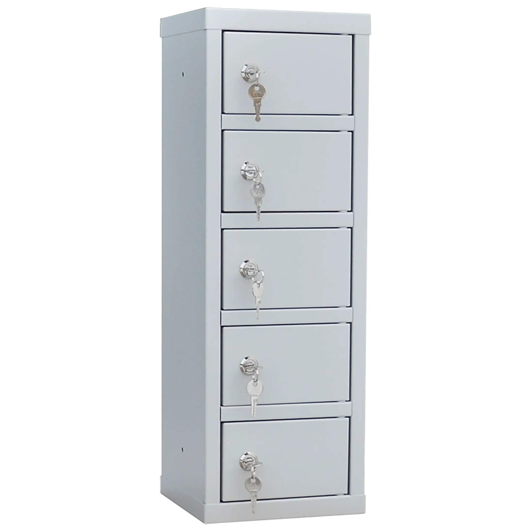 - Минималистичные размеры для размещения в любой точке — шкаф предоставляет 5 индивидуальных запирающихся ячеек в корпусе минимальных габаритов. Его можно установить непосредственно на рабочем столе, кассе, стойке администратора или в автомобиле, не занимая практически никакого полезного пространства.