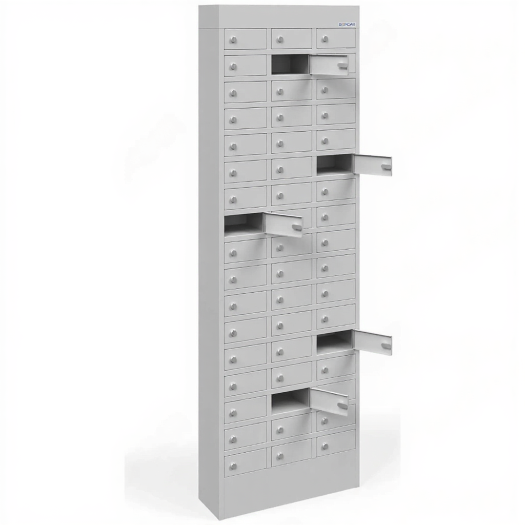 - Большая вместимость для коллективного использования — шкаф предоставляет 51 индивидуальную запирающуюся ячейку, что делает его идеальным для хранения устройств целого производственного цеха, большой рабочей смены, нескольких учебных групп или участников масштабного семинара, полностью устраняя хаотичное хранение телефонов.